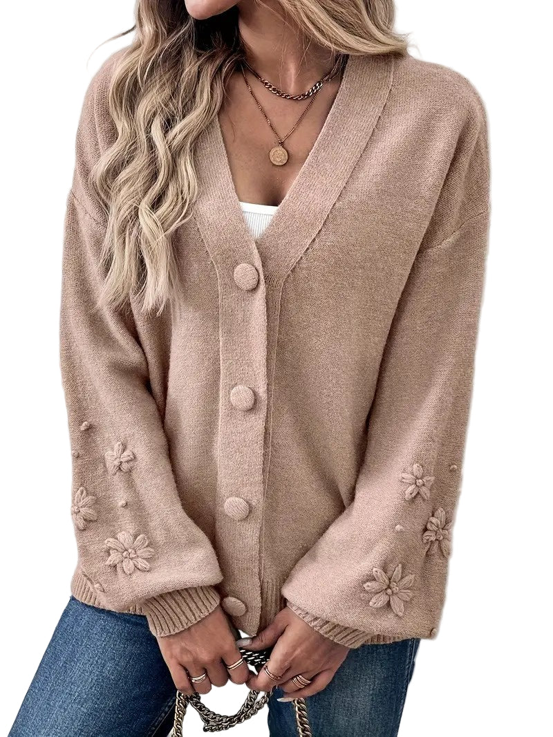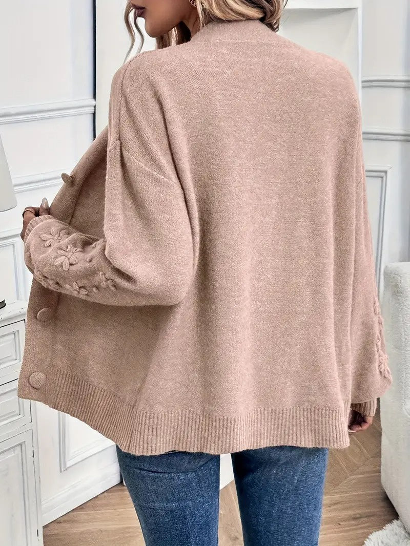 Deze damescardigan heeft een V-hals en een volledige knoopsluiting aan de voorkant. De lange mouwen eindigen in geribde manchetten, en het onderste deel van de mouwen is versierd met bloemenborduursels. Ook de onderkant van de cardigan is geribd.