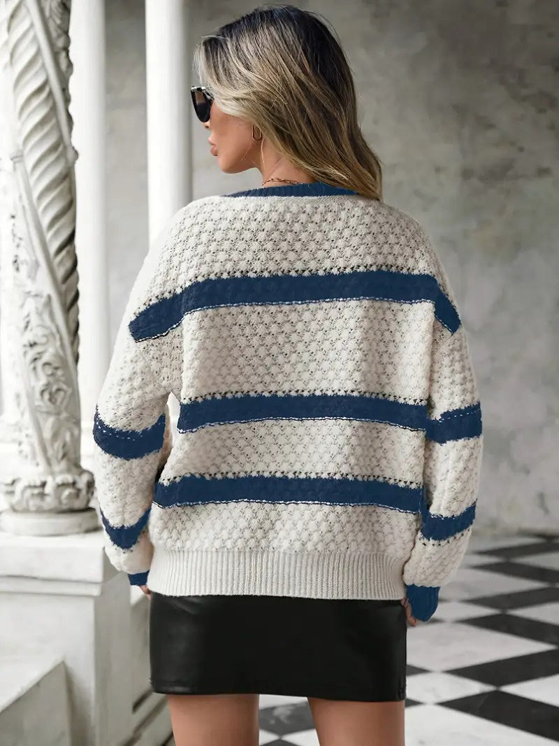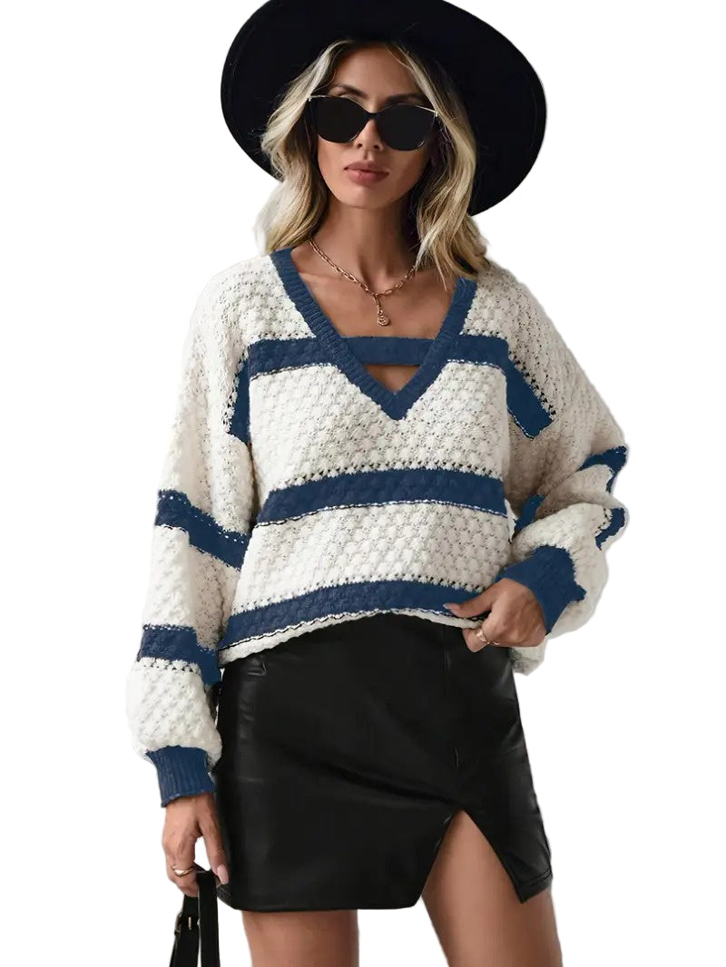 Deze damestrui heeft lange, wijde mouwen die eindigen in aangesloten manchetten. De trui heeft een V-hals en meerdere horizontale strepen die over de borst, rug en mouwen lopen.